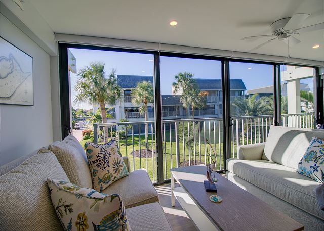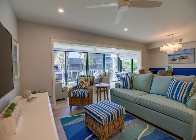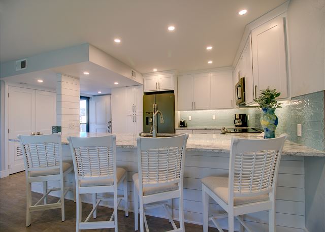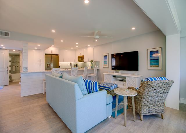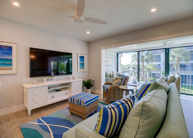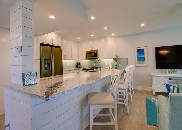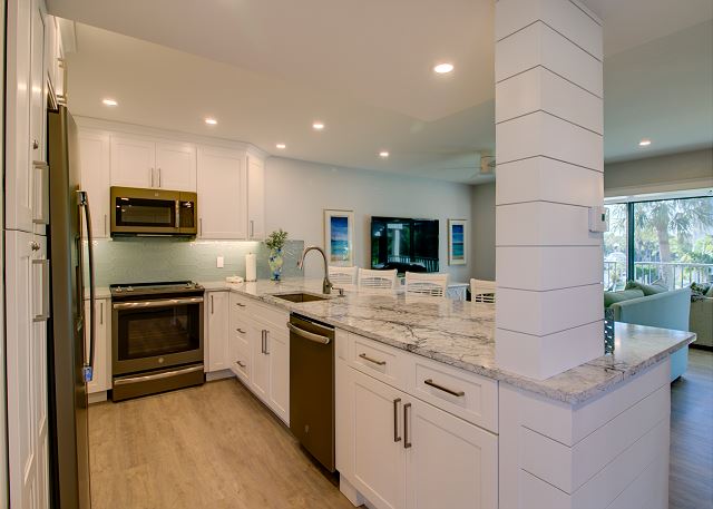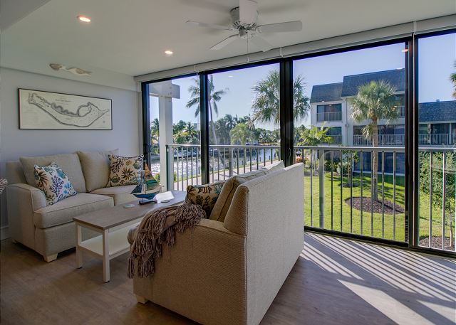 Looking for a place to truly relax on Sanibel with all the perks of home? Look no further, Mariner Pointe #732 is the perfect condo for your next Sanibel vacation! Treat yourself with this stunning 2 bedroom, 2 bathroom condo that features elegant upgrades and renovations throughout newly completed in 2019 that make it the perfect place unwind! The master bedroom features a luxurious King bed with a brand new mattress and an en suite bathroom with a new gorgeous walk-in shower. The guest bedroom offers 2 Twin beds with new mattresses and a separate, private guest bathroom and plenty of space throughout the condo for the whole family to enjoy. Come bask in the endless indulgences this unit has to offer including lots of natural light, new charming beach decor throughout, and the peaceful canal and side bay views allowing for the most relaxing island retreat. Full condo renovations include new plank tile flooring, a gorgeous chef's kitchen with new appliances, and brand new bathrooms! Welcome to your new beachside getaway and an island oasis you'll wish to enjoy year after year! We look forward to seeing you soon!