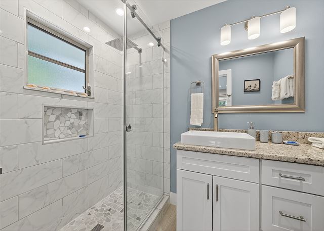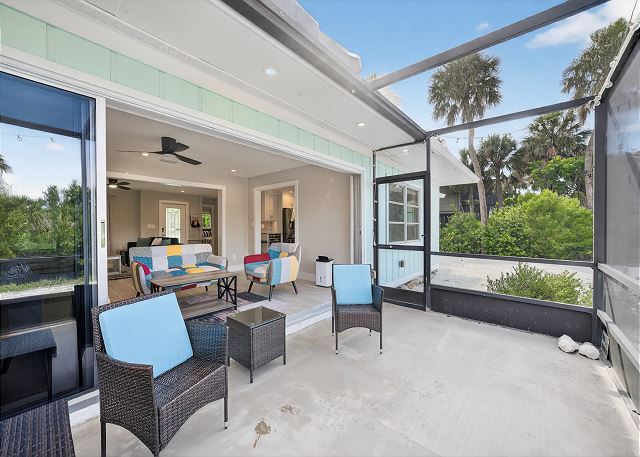 Home amenities include: 3 bedrooms/3 bathrooms -- 2 King beds & 1 Queen bed (sleeps 6), Smart TV's (streaming only), WIFI available, washer & dryer, fully equipped kitchen, BBQ gas grill, screened lanai, private beach access, parking available. No Pets Allowed. Bed linens and bath towels included. Beach chairs, beach towels, and an umbrella are provided for added convenience.