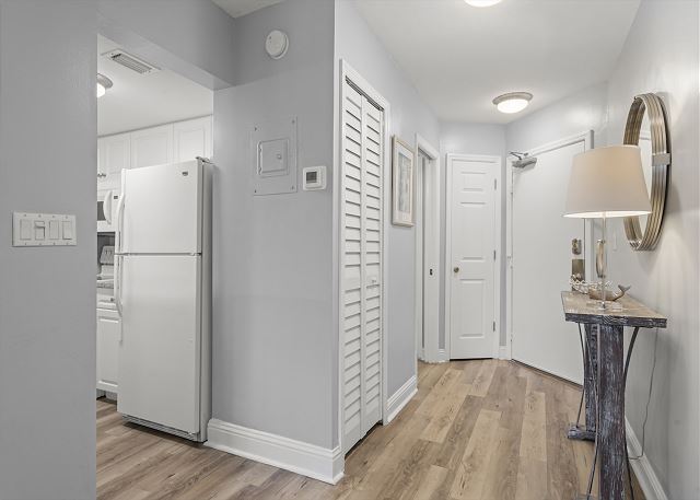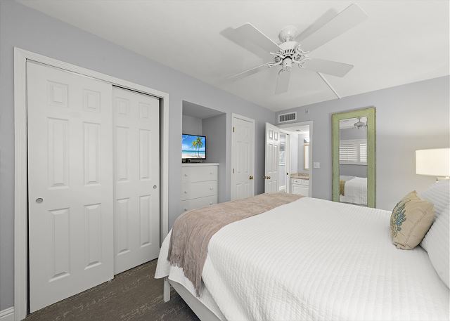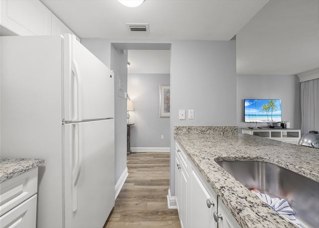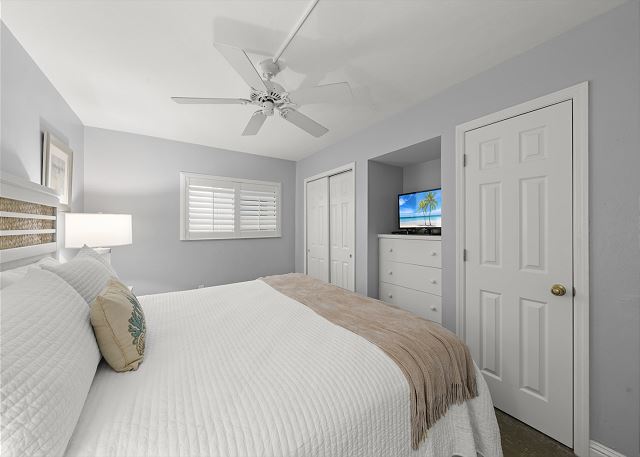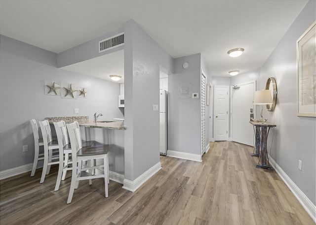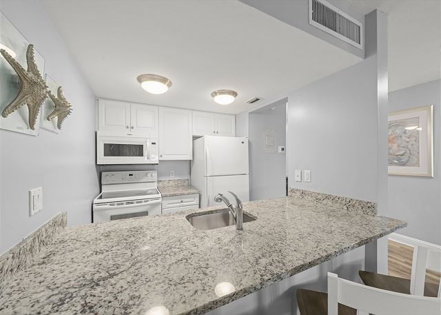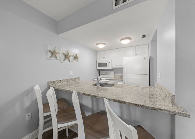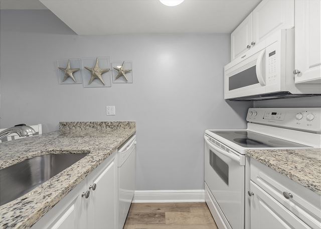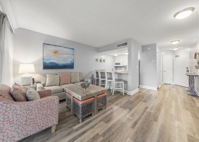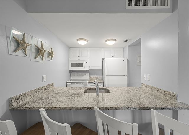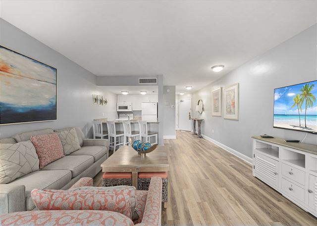 Condo amenities include: 1 bedroom/1 bathrooms -- 1 King bed & pull-out sleeper sofa (sleeps 4), Smart TVs (streaming only), WIFI available, fully equipped kitchen, coin operated laundry facilities on-site, community pool, elevators. Bed linens and bath towels included. No Pets allowed. This unit comes stocked with beach chairs, beach towels and an umbrella.