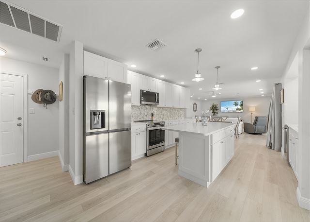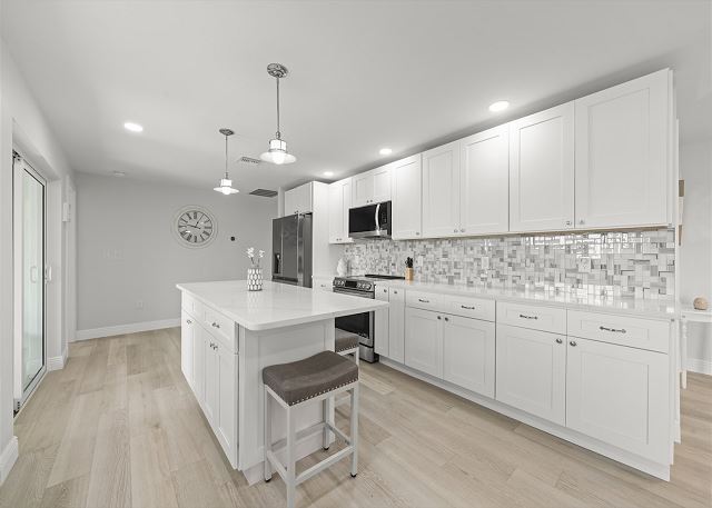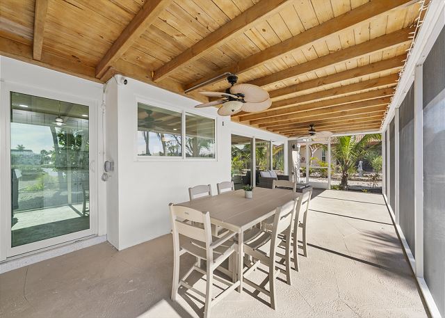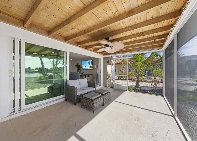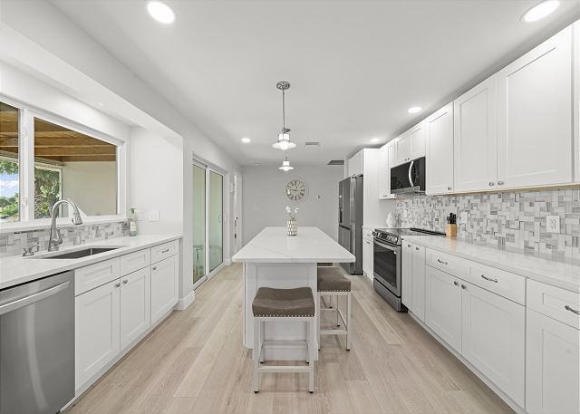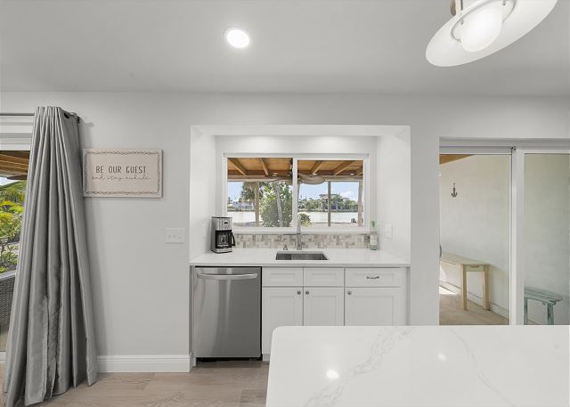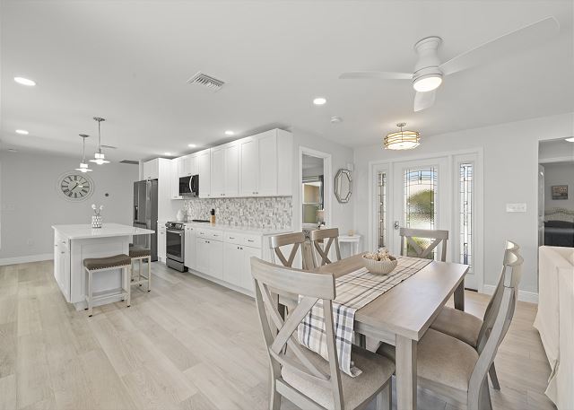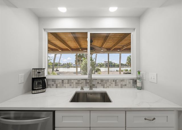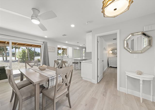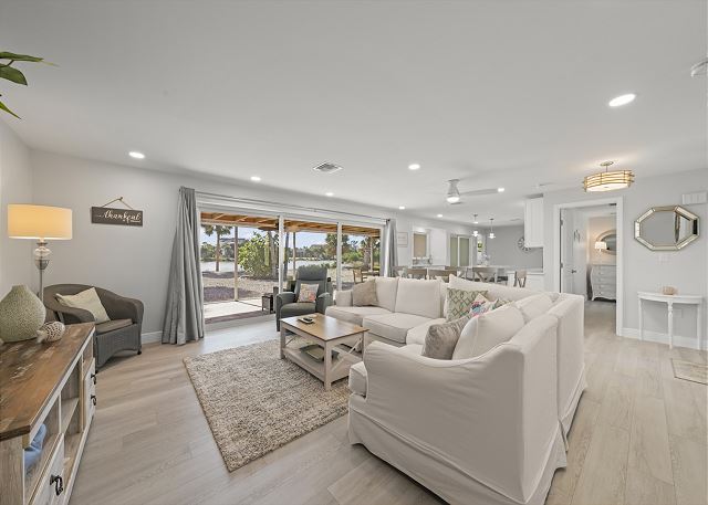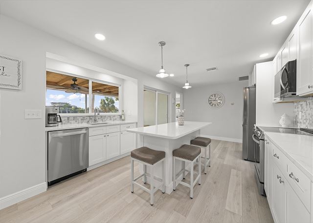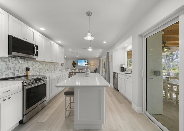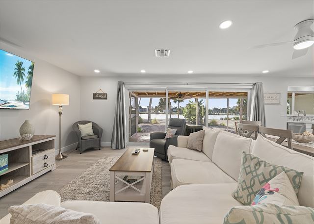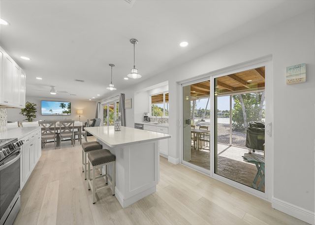 This beautifully updated 3-bedroom, 2-bathroom home blends coastal charm with modern comfort, offering guests a peaceful escape just minutes from the island’s world-famous beaches. Step inside to an open, sun-filled living area framed by expansive sliders that invite stunning lake views into the home. The comfortable seating, soft coastal tones, and seamless flow into the dining area create an inviting space for gathering, unwinding, or simply watching the water shimmer outside. The fully renovated kitchen features sleek white cabinetry, stainless steel appliances, a spacious island, and plenty of room for preparing meals after a day of beachcombing or biking around the island. With its bright, airy layout, it’s a space designed for both convenience and connection. The screened lanai offers a tranquil outdoor living and dining area where guests can enjoy morning coffee, evening cocktails, or quiet time overlooking the lake and lush tropical landscaping. The peaceful backyard setting feels like a private sanctuary—perfect for wildlife watching or soaking in Sanibel’s natural beauty. With three comfortable bedrooms and two well-appointed bathrooms, Tranquility Tides is ideal for families, couples, or groups seeking a relaxing island getaway. Its location in the quiet, walkable Lake Murex community provides a serene atmosphere while still being close to Sanibel’s beaches, restaurants, shopping, and bike paths. "Tranquility Tides" promises calm, comfort, and effortless island living—your perfect place to slow down, breathe deeply, and experience the best of Sanibel.