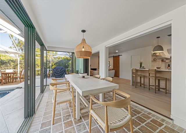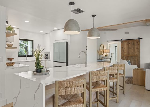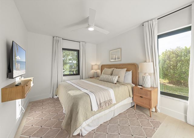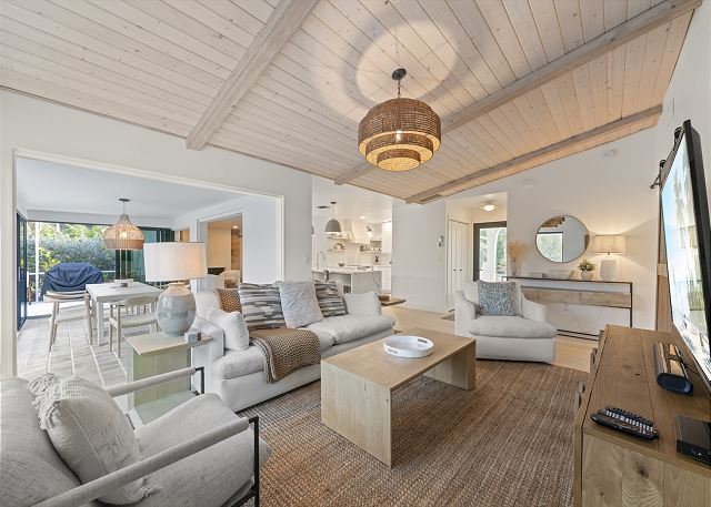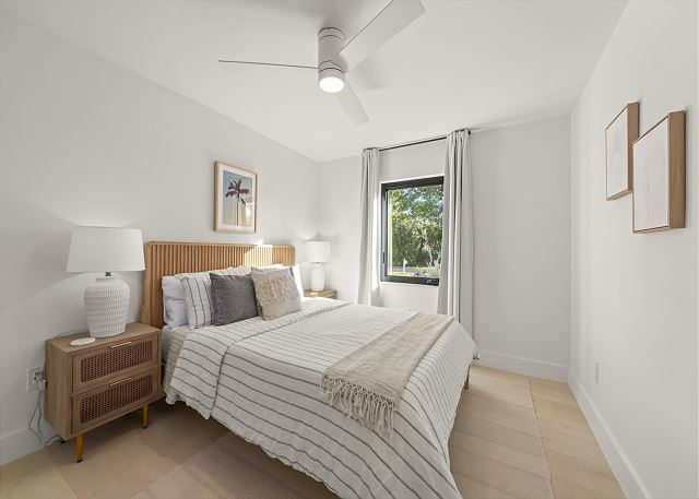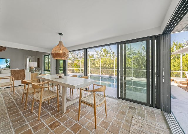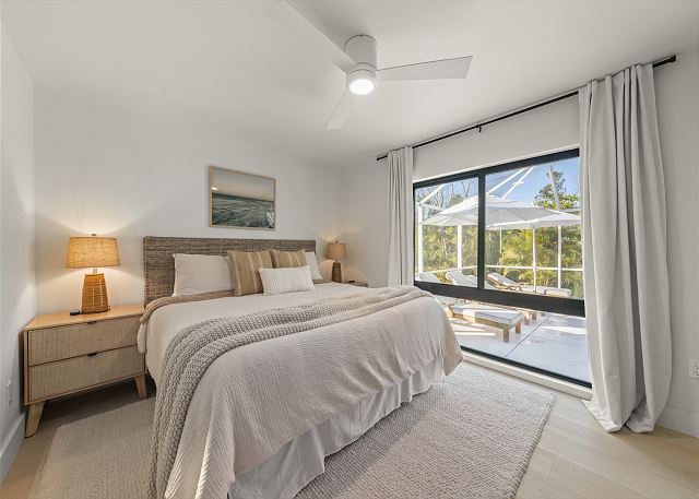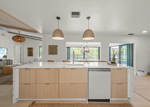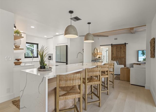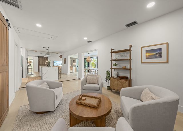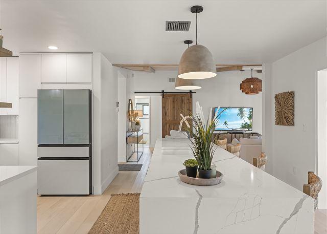 Surrounded by lush tropical landscaping, the home welcomes you with a bright, airy interior featuring an open-concept layout designed for easy island living. The spacious kitchen is a true gathering spot, complete with a large island, clean white cabinetry, and contemporary finishes that flow seamlessly into the living and dining areas. Natural light fills the home, highlighting warm wood accents and a serene coastal aesthetic throughout. The living space opens effortlessly to the outdoors, where you’ll find a private screened pool area—perfect for morning swims, afternoon lounging, or evenings spent under the island sky. Whether you’re enjoying coffee poolside or relaxing after a day at the beach, this home offers a true sense of retreat. With four comfortable bedrooms, there’s plenty of space for families or groups to spread out and feel at home. Thoughtfully furnished and pet friendly, this home ensures every member of your group—two-legged and four-legged alike—can enjoy the island lifestyle.