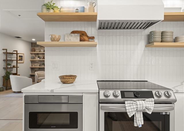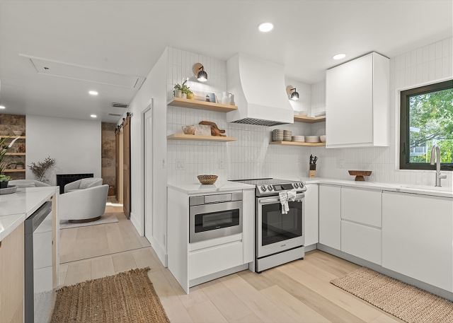 Full Kitchen, Refrigerator, Coffee Maker, Microwave, Toaster, Cookware, Dishwasher, Utensils, Plates & Glassware