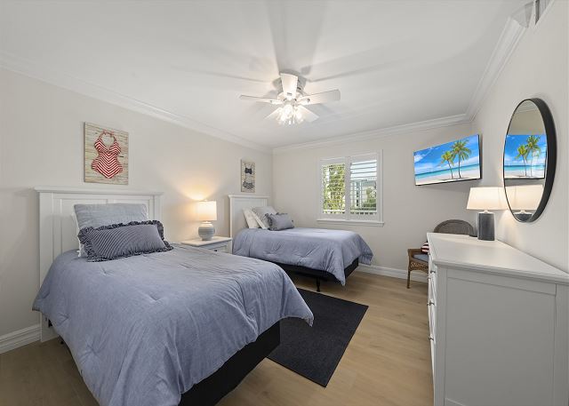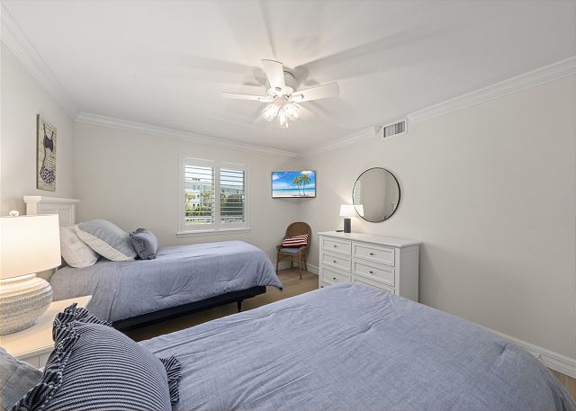 Condo amenities include: 2 bedrooms/2 bathrooms -- 1 King bed & 2 Twin beds (sleeps 4), Smart TVs (streaming only), WIFI available, shared heated pool, in suite washer & dryer, screen & glass enclosed lanai, public BBQ gas grills, shuffleboards, tennis & pickle ball courts, elevators, covered parking. No Pets allowed. Bed linens and Bath towels included. Beach chairs, beach towels, and an umbrella are provided for added convenience.